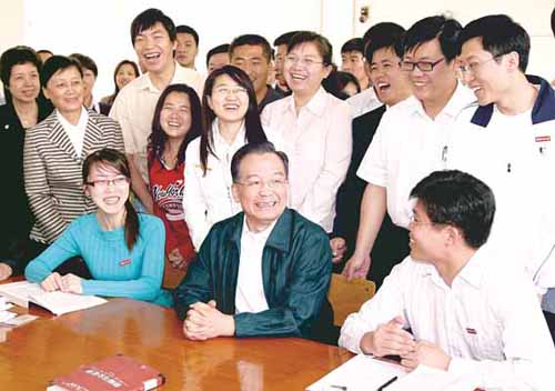 2008年5月4日,中共中央政治局常委、国务院总理温家宝应学生们的热情邀请来到中国政法大学,与大家一起共度青年节。这是温家宝在学校图书馆阅览室与学生们亲切交谈。 新华社记者 姚大伟摄