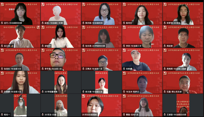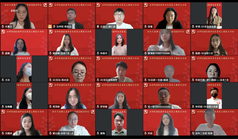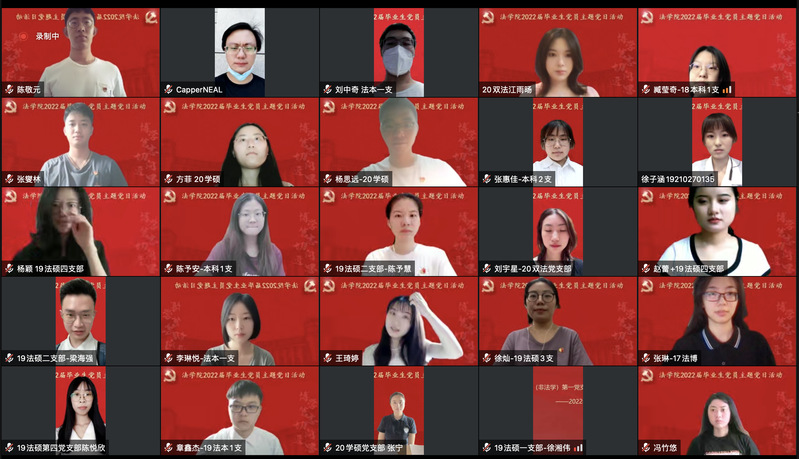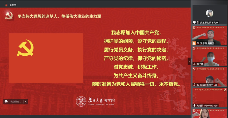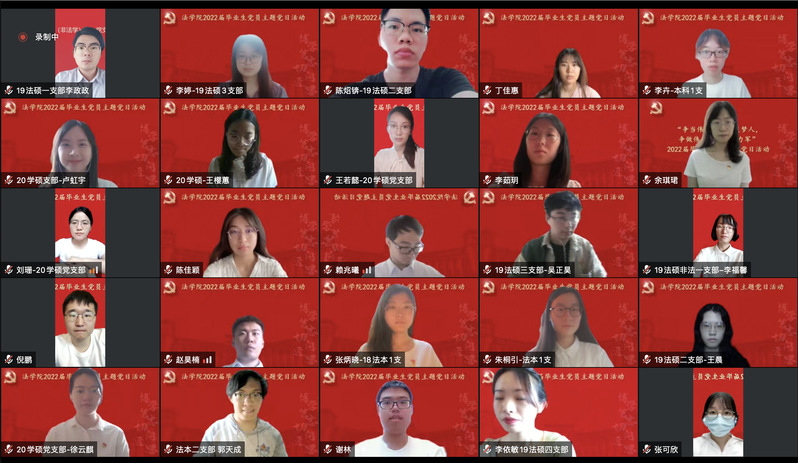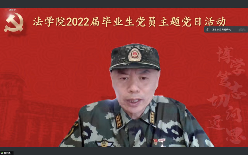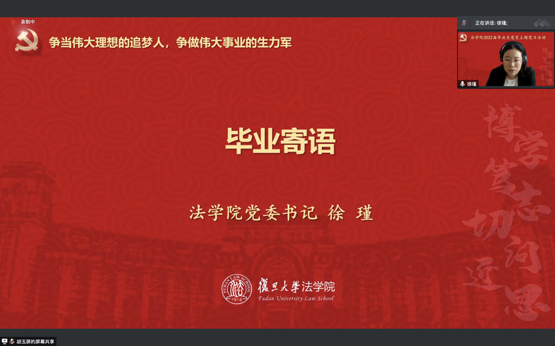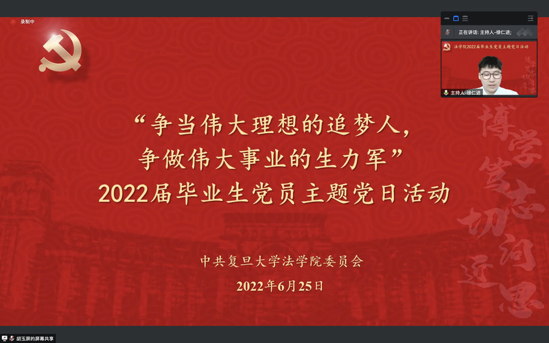 为赓续红色血脉,传承复旦精神,扎实过好毕业生党员在学校期间的最后一次组织生活,引导毕业生党员争做堪当民族复兴重任的时代新人,法学院于2022年6月25日上午举行2022届毕业生党员主题党日活动。学院党委书记徐瑾、党委副书记钟妮、原云南省武警总队政治部主任徐鲁海大校和全体毕业生党员共计184人通过腾讯会议线上参加活动。