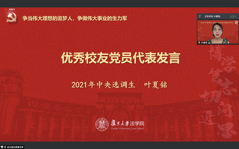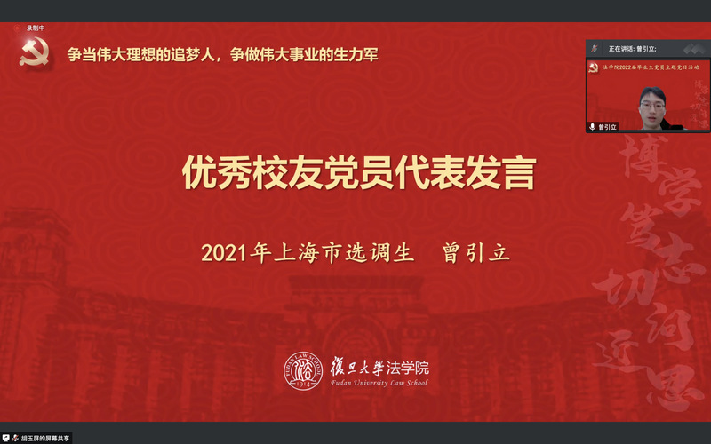 随后,法学院优秀校友党员代表分享青年党员如何在工作岗位中展现责任担当、彰显党员身份。2021届宪法学与行政法学硕士毕业生、上海市选调生曾引立介绍了自己的基层驻村经历,讲述了上海抗疫一线紧锣密鼓的核酸筛查、物资发放的工作情况,表示自己作为一名普通的党员干部,通过投身基层抗疫工作,对为人民服务的党的宗旨有了更深刻的认识。2021届诉讼法学硕士毕业生、中央选调生叶夏铭分享了自己从一名学生党员步入公务员岗位的心路历程,围绕把党员身份放在第一位、保持学习、摆正心态三个方面,讲述了自己在毕业后的实际工作中,坚定“功成不必在我、功成必定有我”思想自觉的过程。