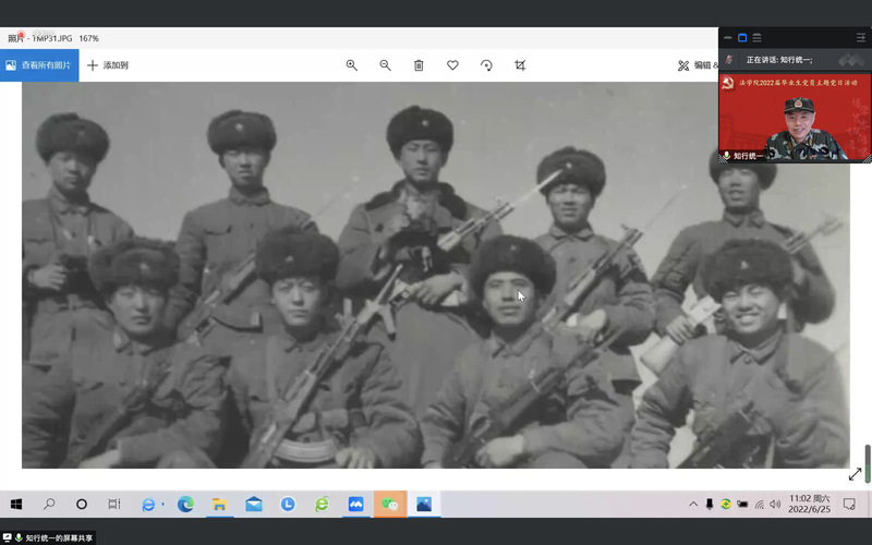徐鲁海大校结合自己在对越自卫反击战中的亲身经历,通过一张张照片、一组组数据,和一个个鲜活的案例,向毕业生党员讲述过去那段艰苦卓绝的峥嵘岁月,带领毕业生党员深刻领会伟大建党精神的丰富内涵和时代价值。昔日的战场上,年轻战士们承受着常人难以想象的困苦,担负着用生命支撑的任务,用坚强不屈的意志和艰苦卓绝的斗争为国家赢得了宝贵的胜利。徐鲁海强调,一寸山河一寸血,今天的幸福生活是无数的革命先烈用鲜血和生命换来的,他勉励毕业生党员牢记习近平总书记对青年的殷切嘱托,争做艰苦奋斗、无私奉献的模范。
