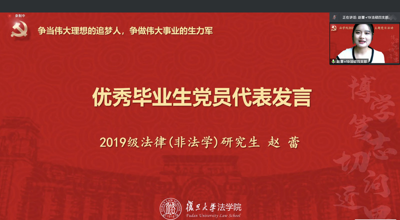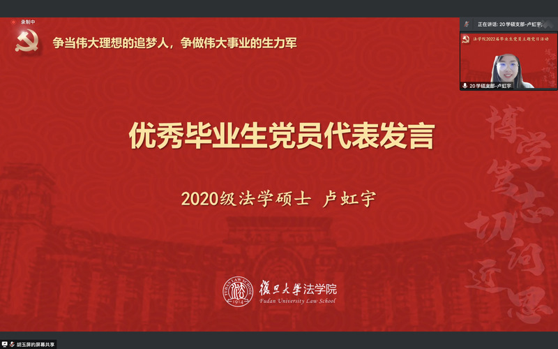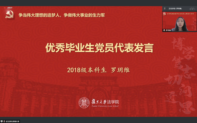 三名优秀毕业生党员结合在学校期间的学习和收获发表毕业感言。2022届法学本科毕业生罗玥维从自己与宪法学的缘分和认识出发,探讨了学生党员如何在学术追求道路上发挥先锋模范作用。2022届宪法学与行政法学硕士毕业生卢虹宇结合自己在复旦本研7年的成长经历和疫情期间校园志愿服务经历,阐述了对党员责任意识和使命担当的理解。2022届法律(非法学)硕士毕业生赵蕾则分享了个人成长经历与心得,并表示今后将继续矢志拼搏,争当伟大理想的追梦人,争做伟大事业的生力军。