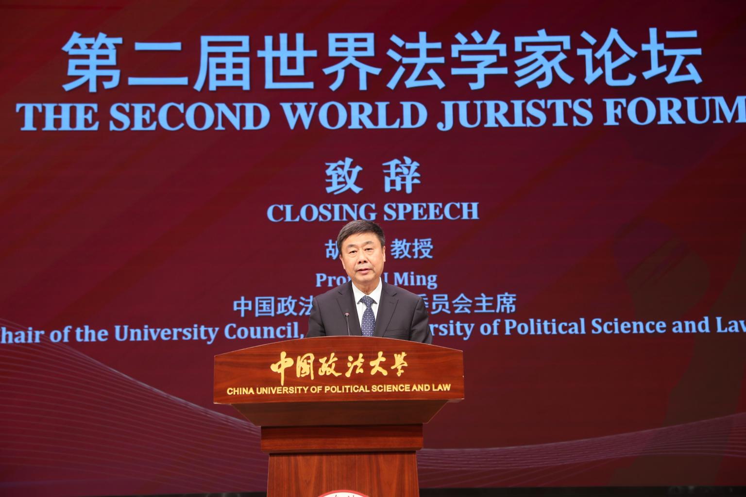 中国政法大学党委书记、校务委员会主席胡明作闭幕致辞。他表示,学校在建设世界一流法学院校的进程中,始终关注全球治理体系变革和法学教育改革,积极回应和解决法治领域的重大理论和实践问题,加强法学教育、创新法学理论、培养法治人才、助力法治建设。中国政法大学充分发挥国际合作交流的桥梁纽带作用,以定期举办“世界法学家论坛”的形式,邀请海内外专家学者和业界精英交流交融、互促互鉴。他强调,全球法学教育合作的前景十分广阔,本届论坛的成果进一步推进中国政法大学教育事业的高质量发展,更推动世界法学教育深化改革、繁荣发展,还为司法机关、教育主管部门和有关决策机构提供了许多建设性的意见。他希望,未来世界法学家交流对话的机制持续巩固,以国际交流赋能人才培养、以务实合作产出一流成果、以知识融通繁荣法治文明。