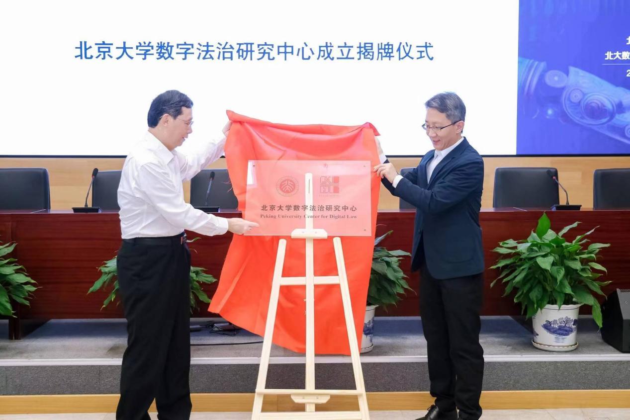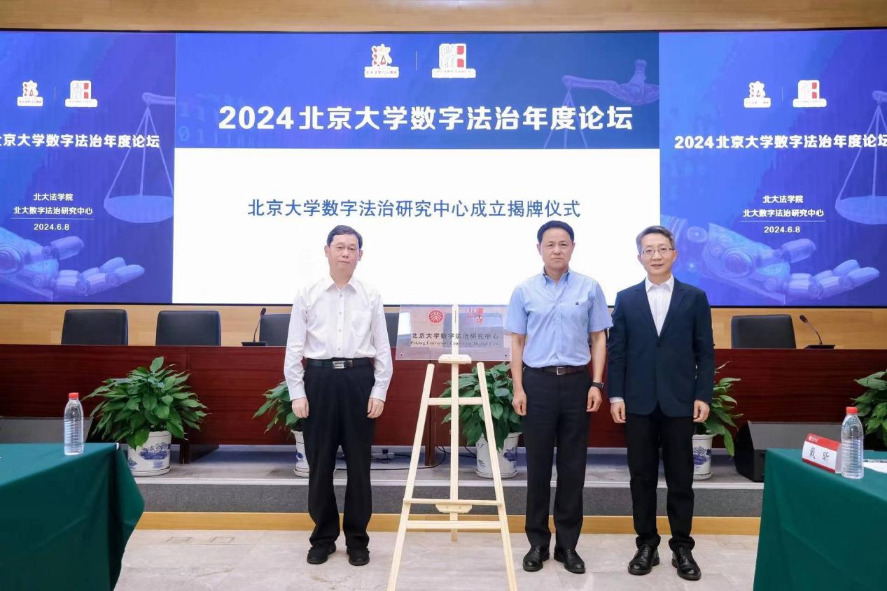 在各位嘉宾的见证下,姜伟会长、郭雳院长和王锡锌教授共同为北京大学数字法治研究中心揭牌。