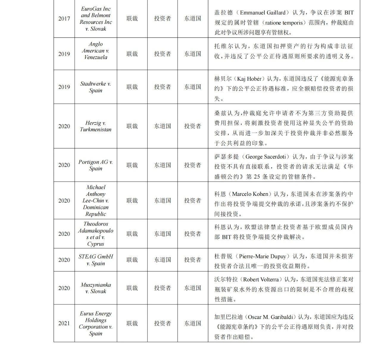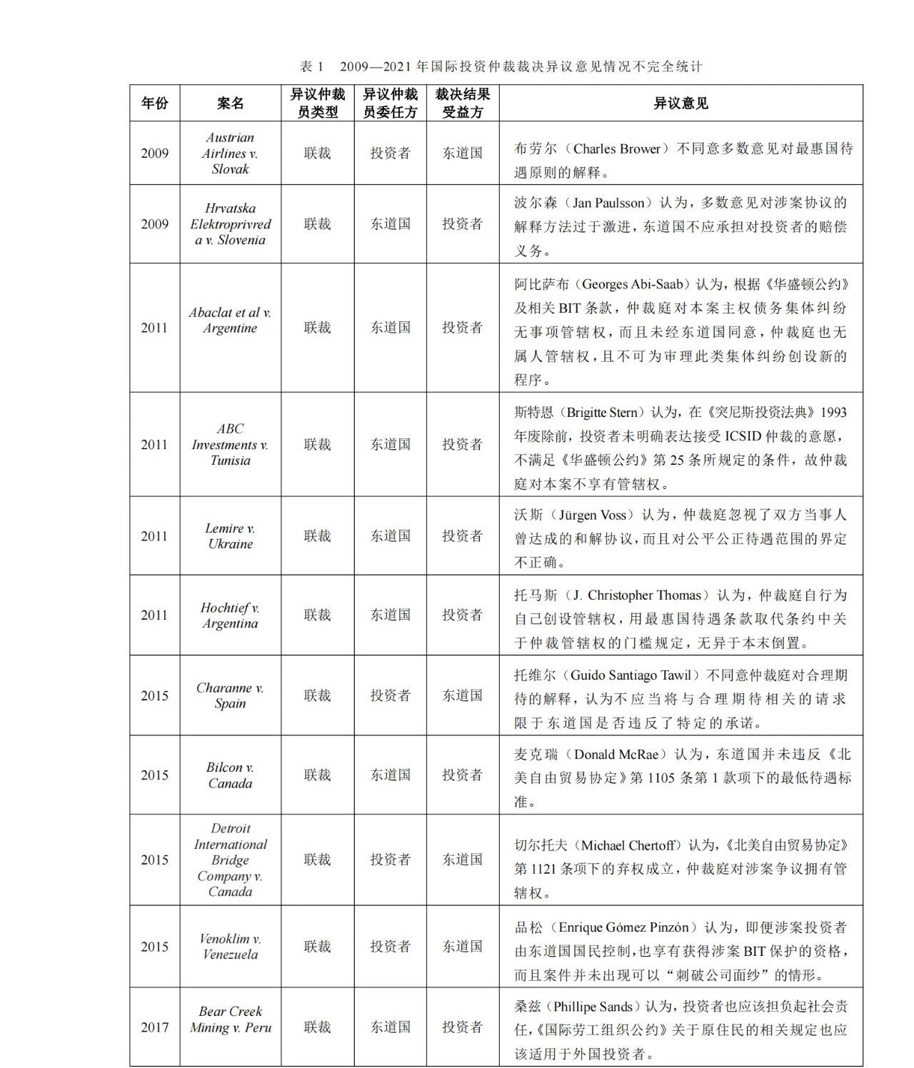 在国际投资仲裁中,绝大多数案件都由3名仲裁员组成的仲裁庭(下文简称三人庭)审理。通常,2名联席仲裁员(下文简称联裁)分别由投资者与东道国政府单方面委任;首席仲裁员(下文简称首裁)则由双方当事人共同委任。作为裁判者,仲裁员在裁判权的行使逻辑上,与法官具有相似性。正如法官的公正性是司法正义的活水之源,仲裁员的公正性对于仲裁正义的实现同样至关重要。无论是首裁还是联裁,都必须独立、公正,同样遵守适用于裁判者的道德规范。据此,在异议意见制度的正常实践下,发表异议意见的仲裁员既可能是联裁,也可能是首裁。现实是,考察迄今为止所有国际投资仲裁案件,首裁发表异议意见的案件凤毛麟角;而联裁发表异议意见的案件则比比皆是。而且,在所有出现异议意见的案件中,发表异议意见的联裁几乎都是由不满裁决结果的一方当事人所委任。以下是笔者随机搜集到的2009年至今出现异议意见的21起国际投资仲裁案件(见表1)。在这些案件中,发表异议意见的仲裁员都是联裁,且其委任方都不是裁决结果的受益方。