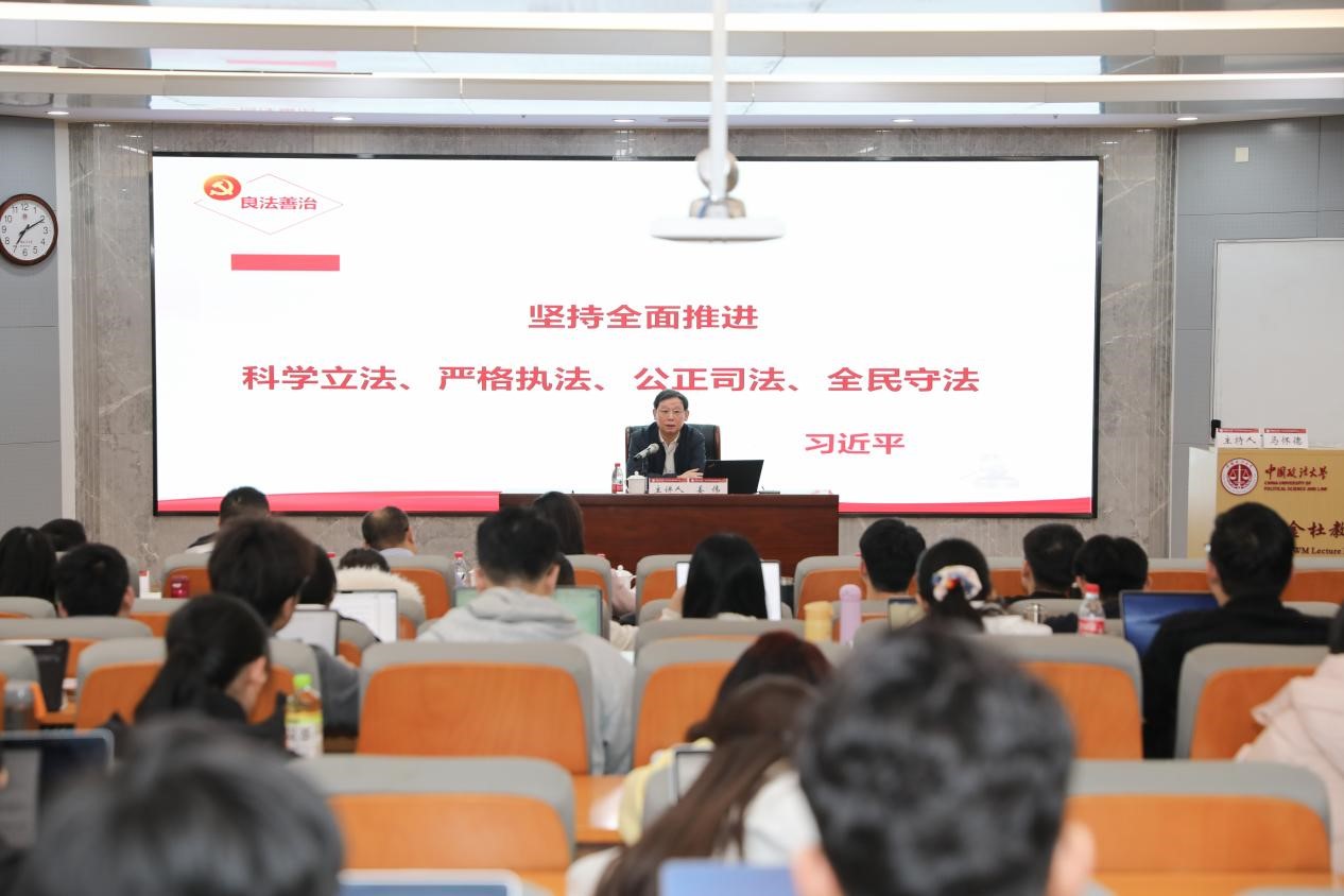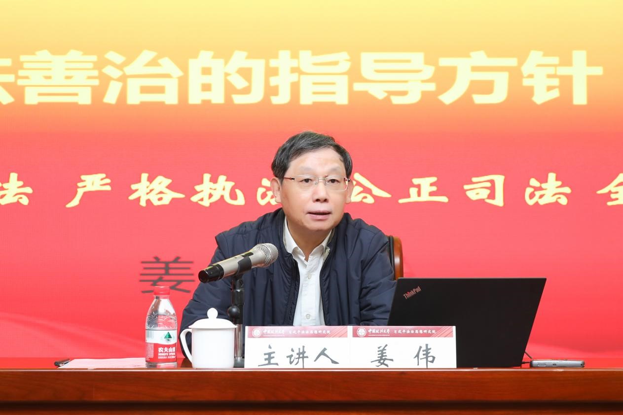 在讲座中,姜伟首先对良法善治观念的产生、发展以及代表性学者和学说进行简要梳理,厘清了良法善治的基本内涵与要求。接着,他结合我国法治建设进程,点明我国良法善治的根本要求是以人民为中心,维护公平正义,良法善治的实践路径包括立法、执法、司法、守法四个环节,良法善治的重点任务是要深化法治领域改革,良法善治的领导方式是坚持党领导立法、保证执法、支持司法、带头守法。
