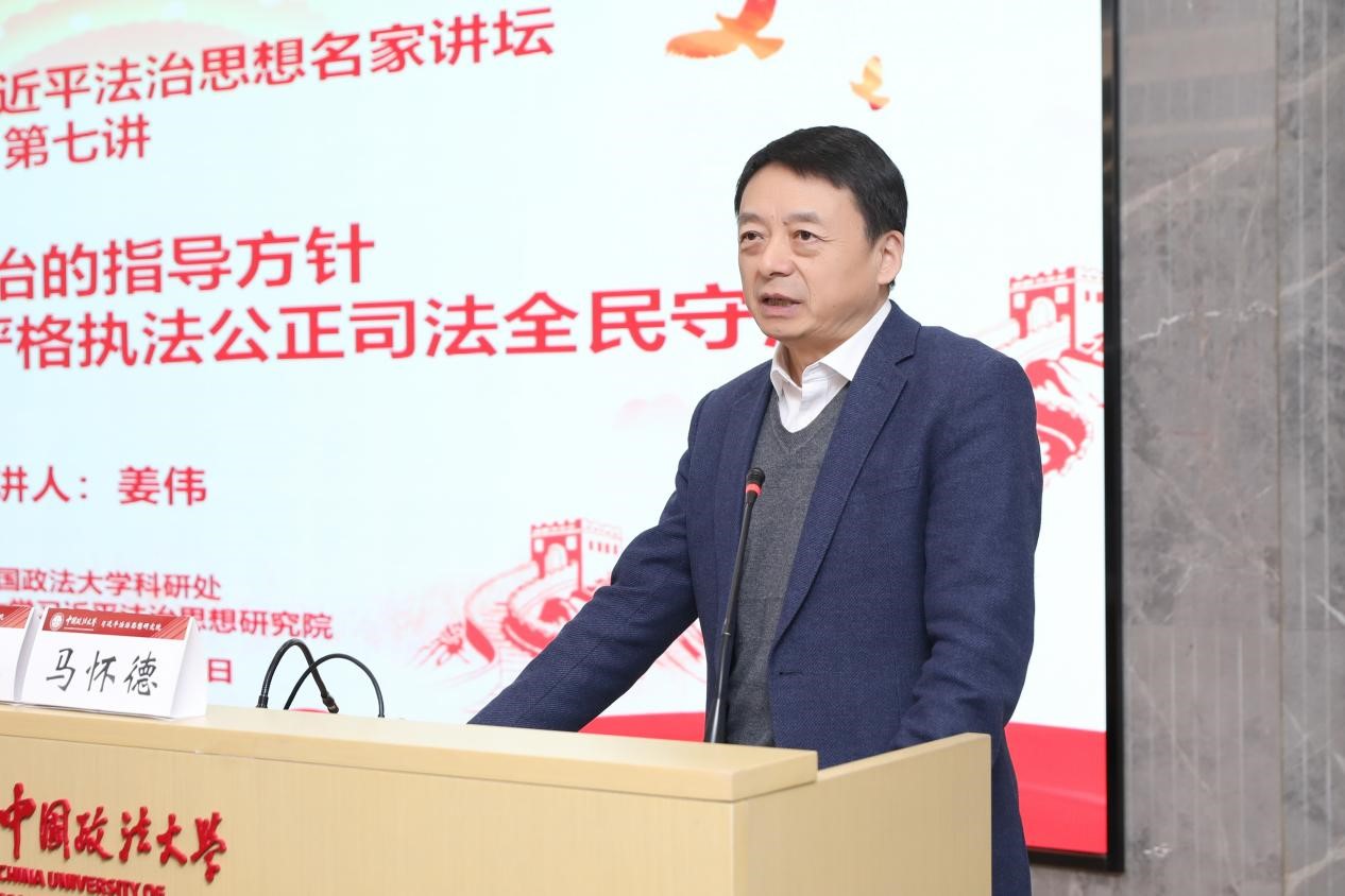 11月27日,由中国政法大学科研处、习近平法治思想研究院主办的“中国政法大学习近平法治思想名家讲坛”第七讲在海淀校区举行。中国法学会副会长、中国法学会网络与信息法学研究会会长,最高人民法院咨询委员会副主任委员姜伟主讲“良法善治的指导方针——坚持科学立法、严格执法、公正司法、全民守法”。中国政法大学近百名师生参加了论坛。校长马怀德主持论坛。