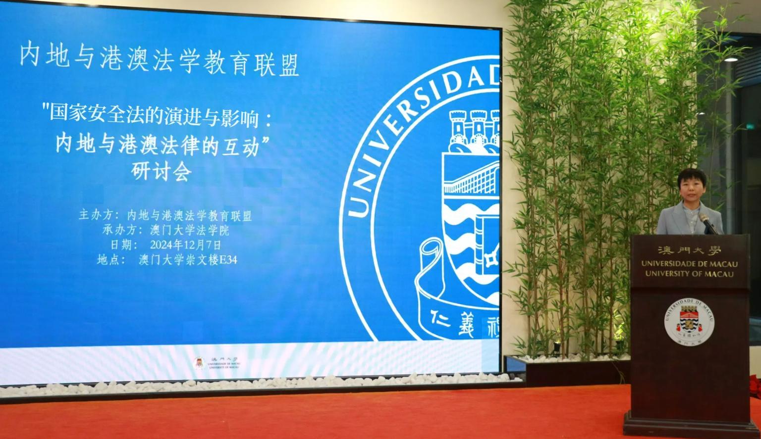 12月7日,“内地与港澳法学教育联盟”(以下简称“联盟”)国家安全法的演进与影响:内地与港澳法律互动研讨会在澳门大学召开。中央人民政府驻香港特别行政区联络办公室法律部副部长王建源、处长潘宝良,中央人民政府驻澳门特别行政区联络办公室法律部二级巡视员刘佳慧、处长高真,全国人大常委会港澳基本法委员会研究室处长别致、副处长吴俊,教育部港澳台事务办公室一级调研员张静,中共中央港澳办八局副处长宋培,中国政法大学校长马怀德、澳门大学法学院院长唐晓晴等出席研讨会开幕式。来自内地与港澳地区18家联盟成员院校的专家学者共计40余人参会。本次会议由联盟秘书处主办,澳门大学承办。澳门大学法学院院长唐晓晴主持研讨会。