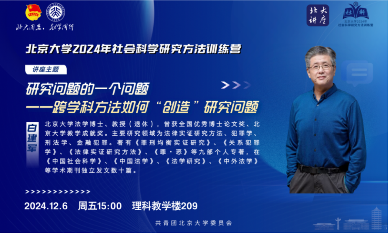 12月6日,北京大学社会科学研究方法训练营将邀请白建军教授,以当下学科交叉大背景为底色,从自身丰富的研究领域出发,不仅“授人以鱼”,更侧重于“授人以渔”,为学生讲述如何在跨学科中抓住关键矛盾,从而“创造”出具有深远意义的研究问题。白建军教授将以生动的案例分析和深入浅出的讲解,引导同学们跳出传统学科框架束缚,学会从多角度、多层次去审视和分析问题,鼓励他们在跨学科研究探索中尝试和创新,拓宽学术视野,深化对社会科学研究方法的理解和应用。