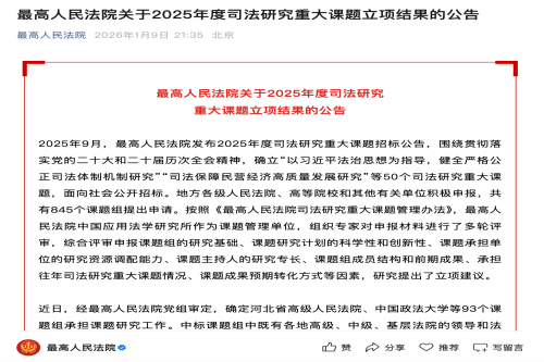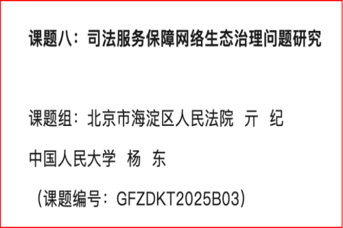 本课题为最高人民法院2025年度司法研究重大课题,由北京市海淀区人民法院与中国人民大学法学院联合申报,杨东、亓纪担任双主持人。课题聚焦司法服务保障网络生态治理核心问题,从主体责任、权益保护、竞争秩序、法律规制四大维度展开研究,旨在破解当前网络生态治理司法实践痛点,完善新类型案件裁判规则,健全网络综合治理体系,为数字经济高质量发展筑牢法治根基,兼具重要的司法实践价值与理论创新意义。