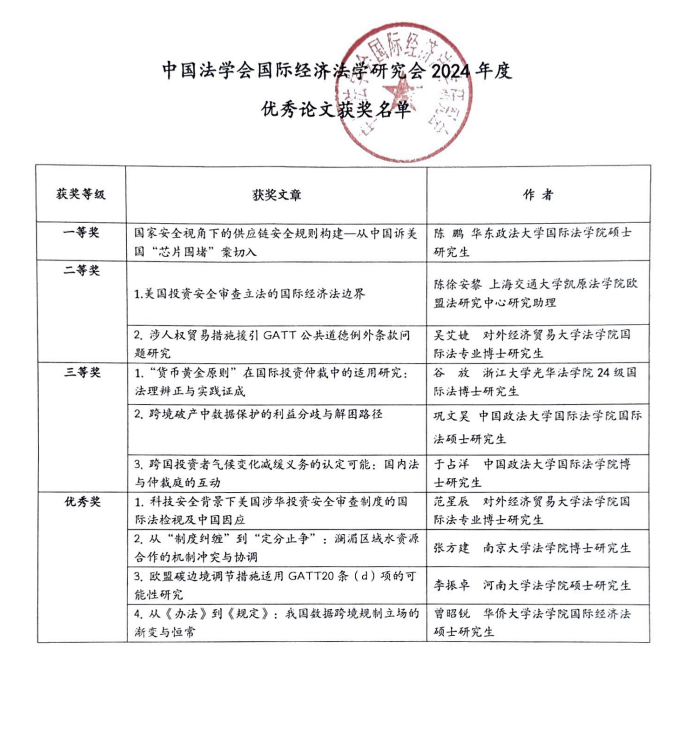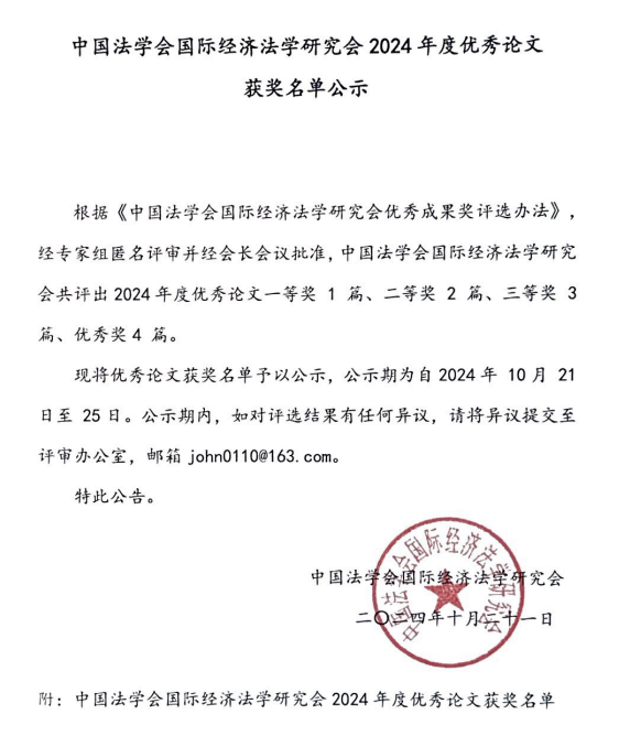 中国法学会国际经济法学研究会2024年度优秀论文获奖名单公示
