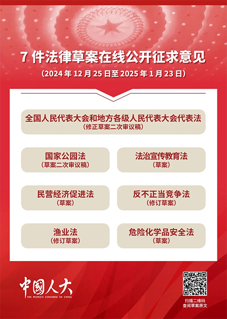 2024年12月25日起,7件法律草案公开征求意见,截止日期为2025年1月23日。