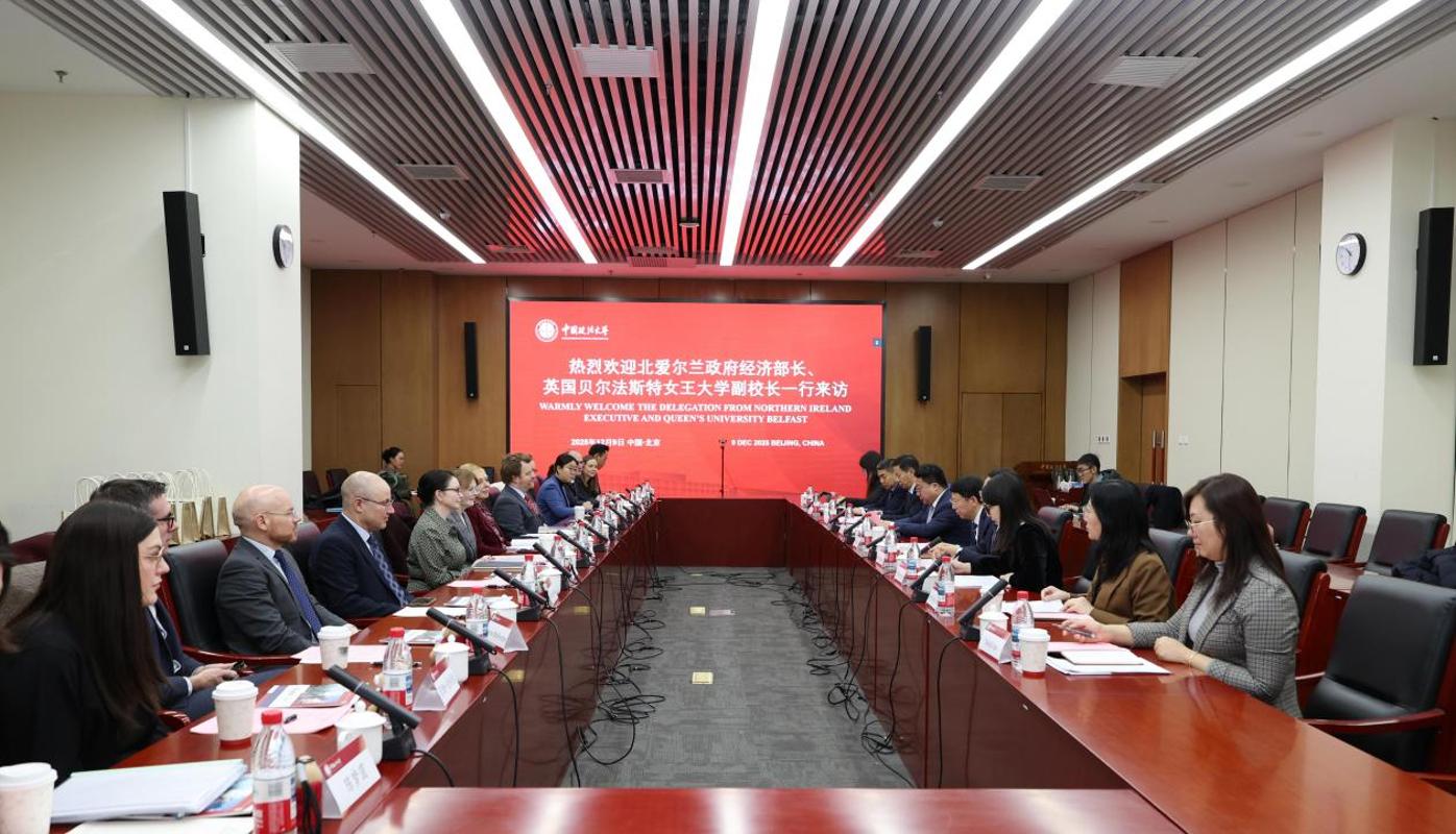 12月9日上午,中国政法大学党委书记、校务委员会主席姜泽廷在学院路校区会见来访的北爱尔兰政府经济部部长席瓦·阿奇博尔德(caoimhe archibald),贝尔法斯特女王大学(以下简称“女王大学”)副校长玛格丽特·托平(margaret topping)、协理副校长罗宾·希基(robin hickey)一行访问中国政法大学。副校长王敏、于飞陪同。